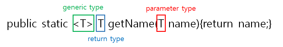 // T : 매개변수의 타입 ( U, E 등으로 다른 이름으로 지정해서 활용 가능 )