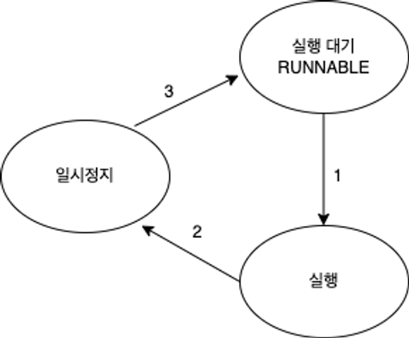 thread1은 실행대기 상태로 변경되면서 남은 시간은 thread2에게 리소스를 양보