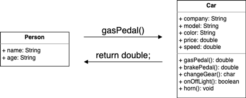 ex. 사람 객차가 자동차 객체가 가지고 있는 가속 페달 메서드를 호출