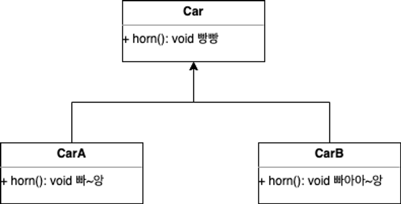 - 객체가 연산을 수행할 때 하나의 행위에 대해 각 객체가 가지고 있는 고유한 특성에 따라 다른 여러가지 형태로 재구성되는 것을 의미