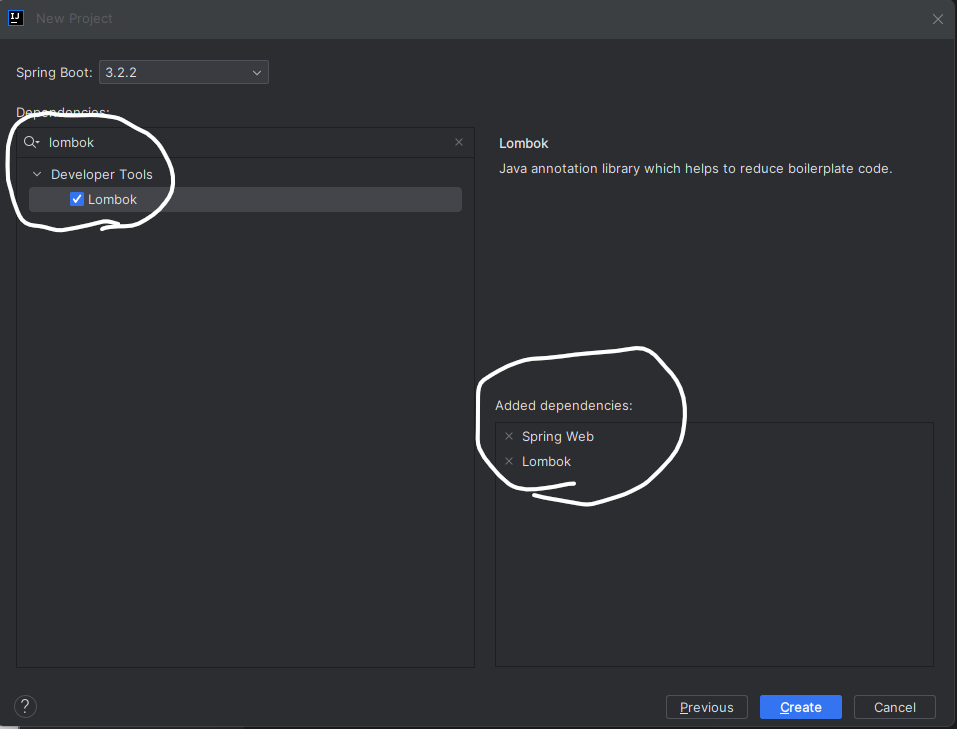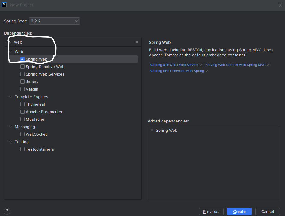 Dependencies에서 'Spring Web'을 검색해서 추가하기