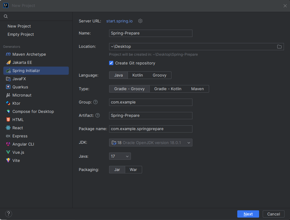 만약 IntelliJ Community를 사용하고 있다면 Spring Initializr가 없을 것이다. 이 경우 다음 게시글을 참고하자.