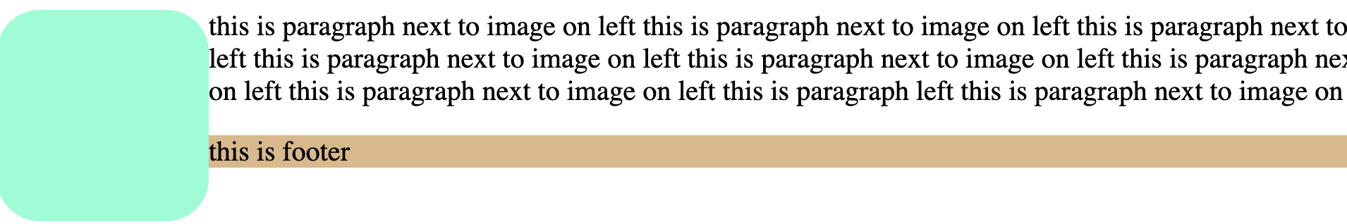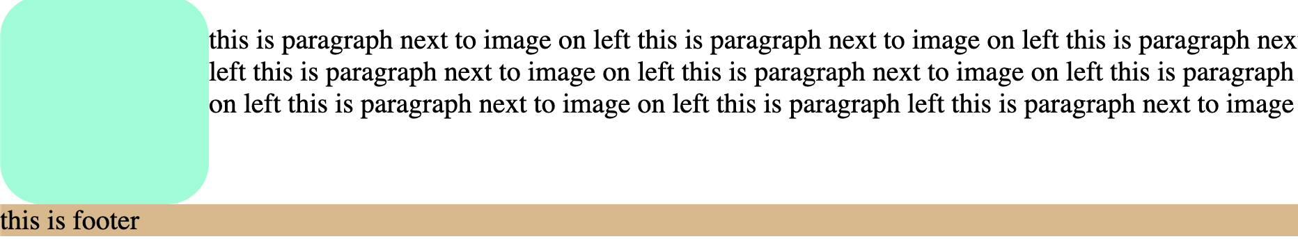 <section> <div class="image-left"></div> <p> this is paragraph next to image on left this is paragraph next to image on left this is paragraph next to image on left this is paragraph next to image on left this is paragraph next to image on left this is </p> </section> <footer>this is footer</footer>