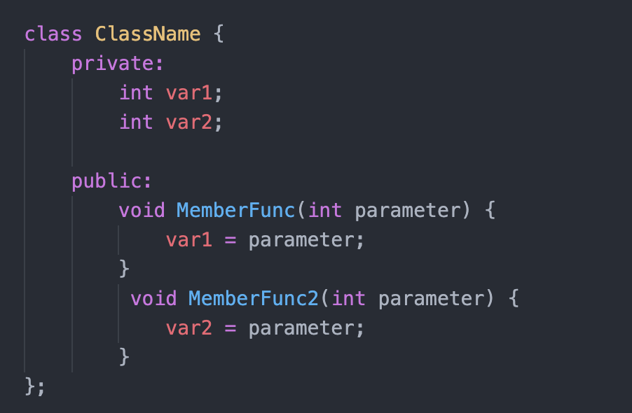 클래스는 추상화를 사용자 정의 타입으로 구현한 것이라고 할 수 있다. C++에서 클래스를 선언하는 방법은 C에서 구조체를 선언하는 방법과 거의 유사하다. 구조체에서 struct 키워드를 이용했지만, 클래스에서는 class 키워드와 접근 제어 지시자를 함께 사용한다.