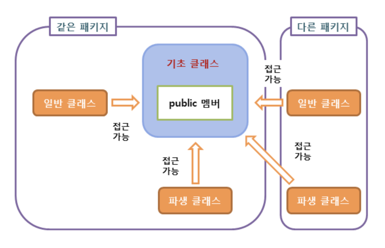 - 이 멤버를 선언한 클래스에서 public 또는 protected 접근 제어로 파생된 클래스