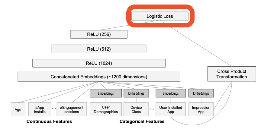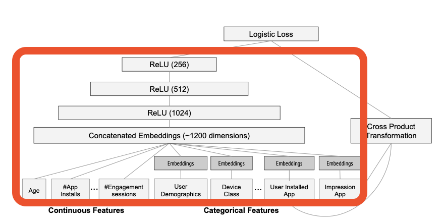 먼저 categorical feature는 embedding layer를 통해 저차원의 특성으로 변환되며, Continuous feature와 concatenate되어 심층 신경망의 입력이 됩니다. 이 때, 임베딩 층은 랜덤으로 초기화되며 모델 학습과정에서 함께 학습됩니다.
