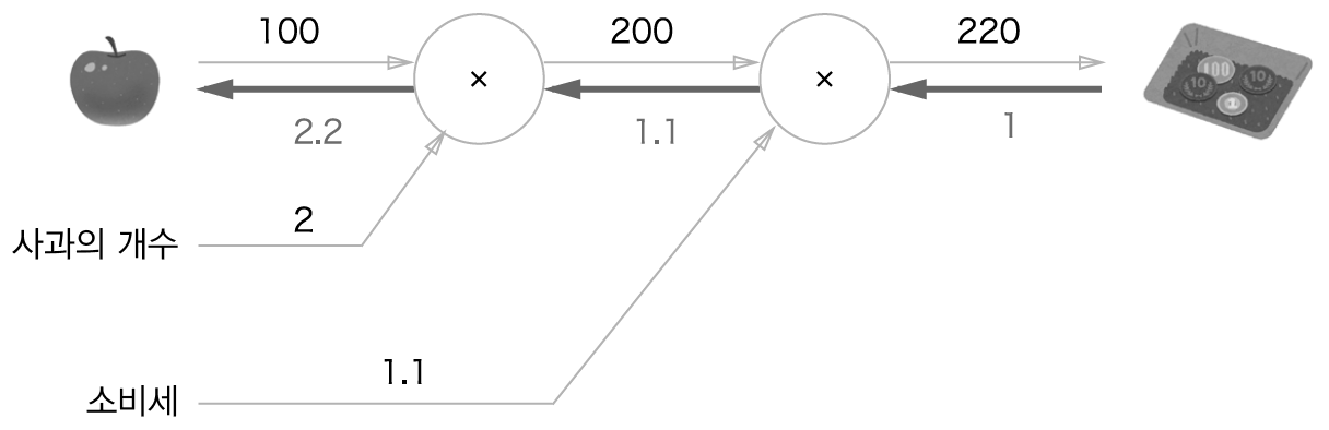 사과의 개수, 소비세에 대한 미분 값도 같은 과정을 통해 구할 수 있음