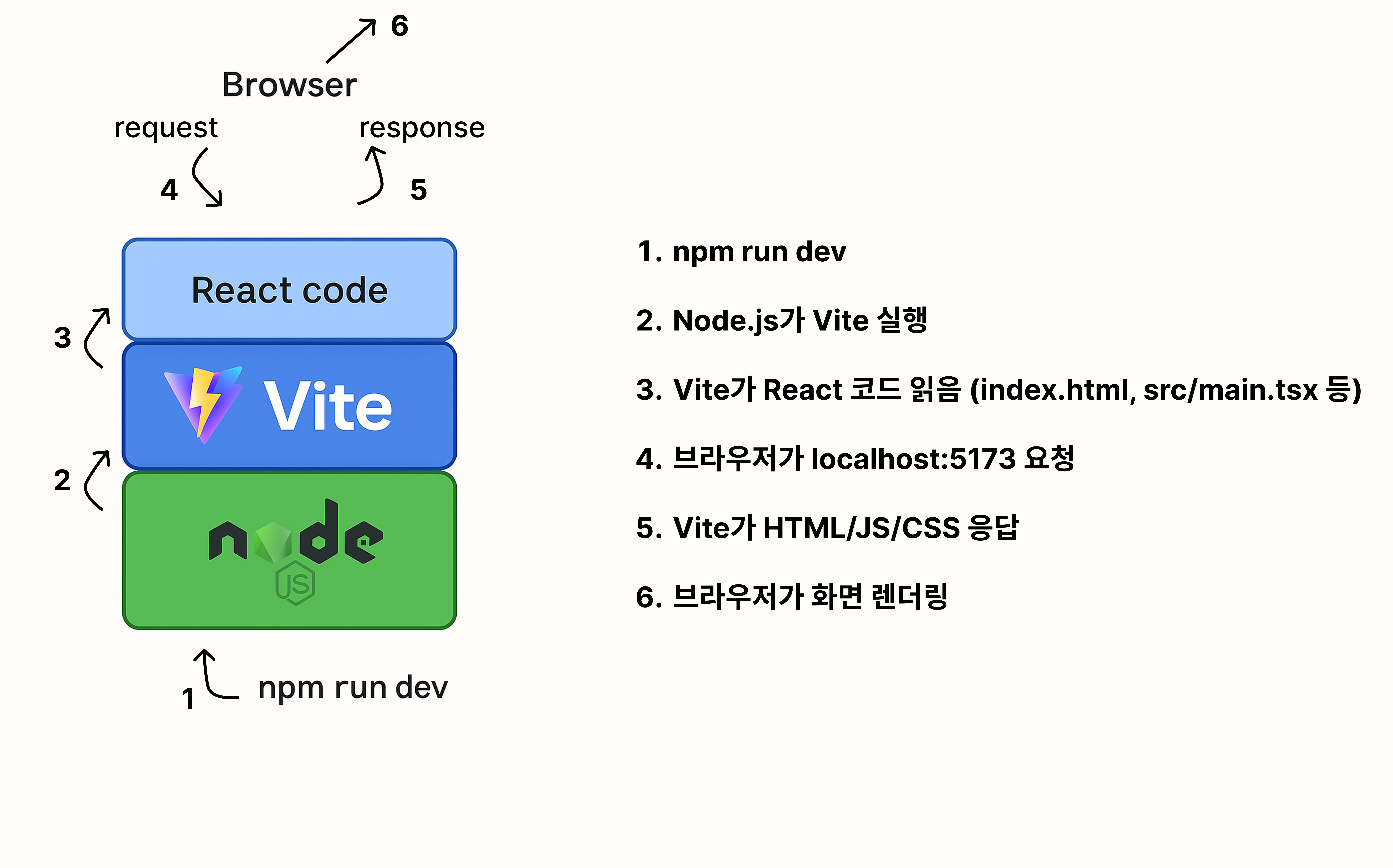 npm run dev → Vite가 실행된다.localhost:5173이라는 웹서버가 열린다.index.html을 응답한다.<script src="/src/main.tsx"> 같은 게 있으면 js, css 파일들도 요청하고 응답 받는다.즉, 이렇게 되기 때문에 npm run dev를 하게 되면 http://localhost:5173 을 반환하여 여기로 접근하면 내가 파일을 줄게~ 하기 때문에 웹페이지가 등장할 수 있는 것이다.