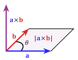 𝐴×𝐵=∣𝐴∣∣𝐵∣sin(𝜃)𝑛 여기서 ∣𝐴∣와 ∣𝐵∣는 각각 벡터 𝐴와 𝐵의 크기이고, 𝜃는 두 벡터 사이의 각이다. 𝑛은 두 벡터가 이루는 평면에 수직이고 크기는 ∣𝐴∣∣𝐵∣sin(𝜃)인 새로운 벡터이다.