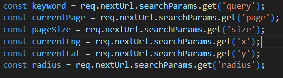 클라이언트에서 URLSearchParams로 필요한 데이터들을 담아서 서버에 요청했다. 그리고 위 코드처럼 서버에서는 req.nextUrl.searchParams.get()로 접근해서 클라이언트에서 설정한 키 변수를 그대로 작성해서 값을 가져온다. 그리고