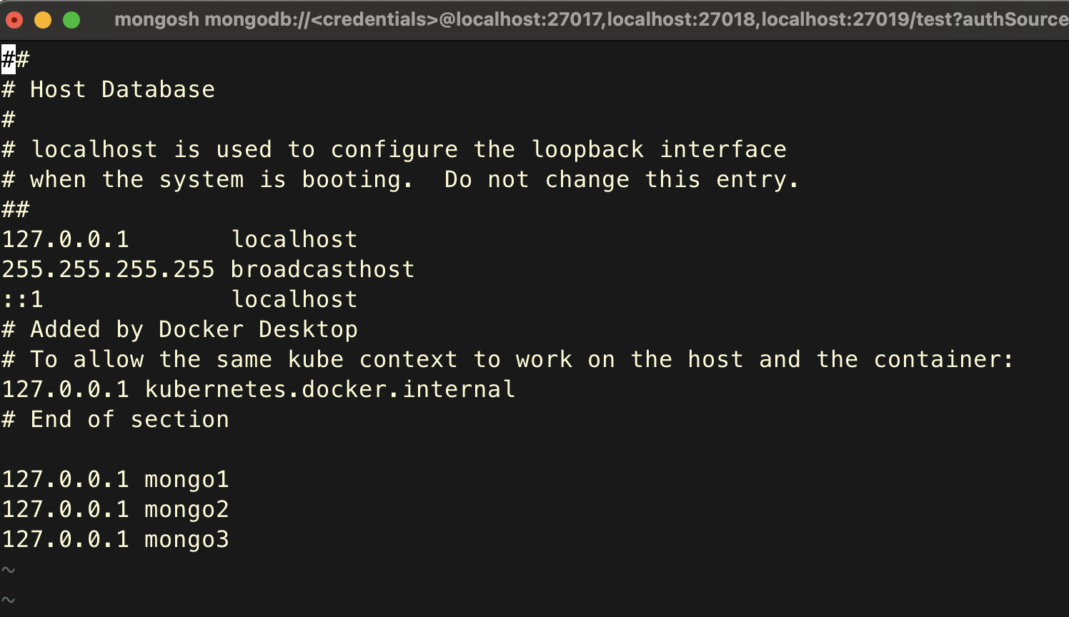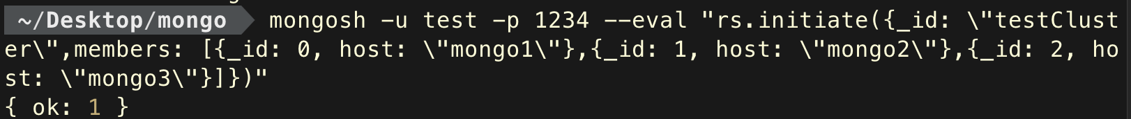 mongosh -u test -p 1234 --eval "rs.initiate({_id: \"testCluster\",members: [{_id: 0, host: \"mongo1\"},{_id: 1, host: \"mongo2\"},{_id: 2, host: \"mongo3\"}]})"