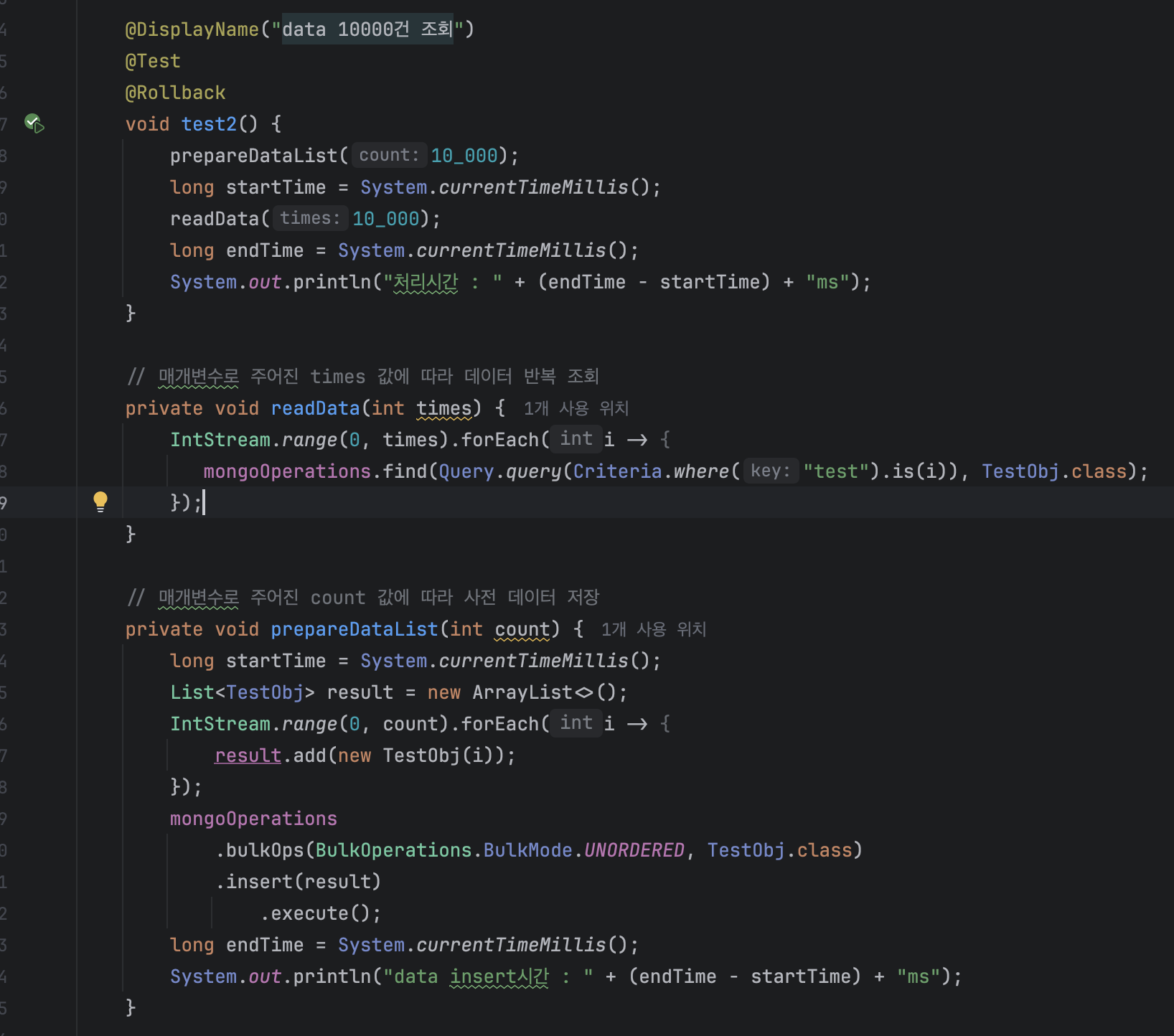 무료 클러스터에 데이터 10000건 batch insert 후 10000번 조회한 결과입니다.