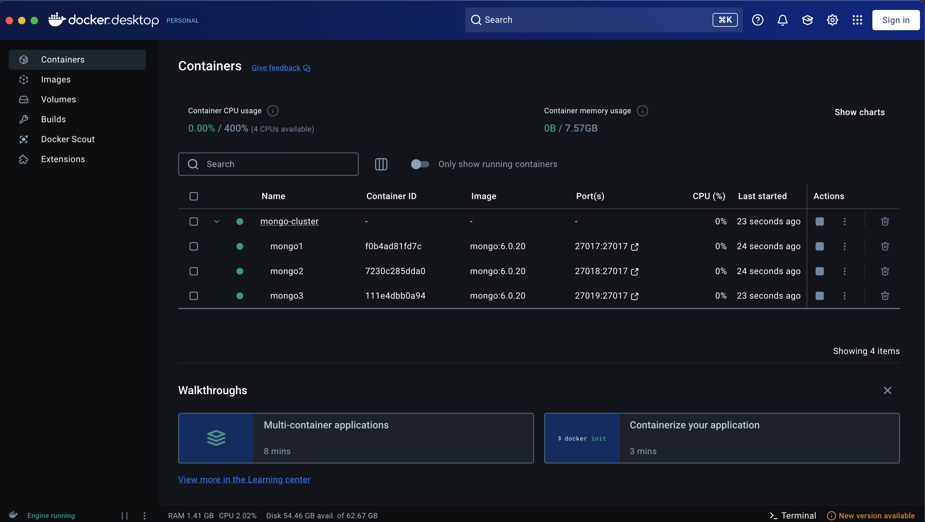커맨드를 입력하고 docker desktop app의 화면을 보면 아래와 같이 클러스터가 형성됩니다