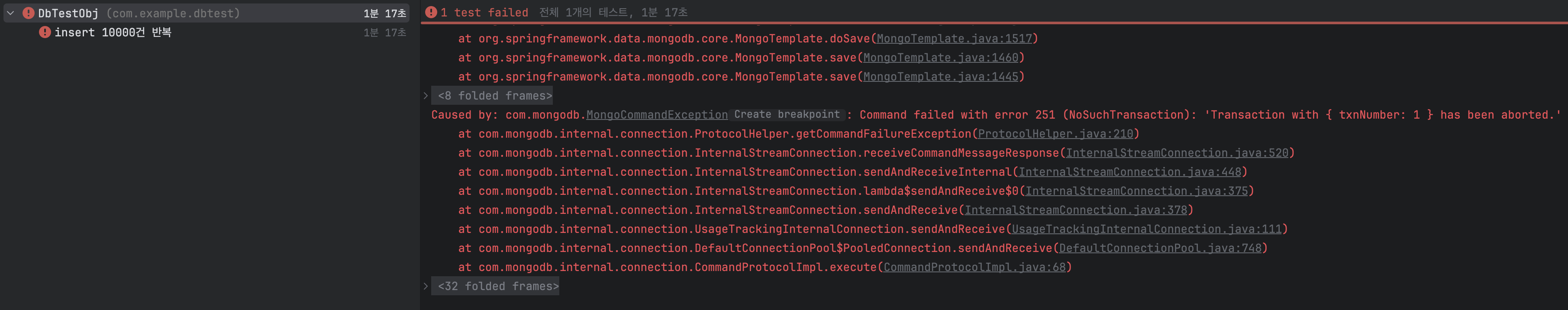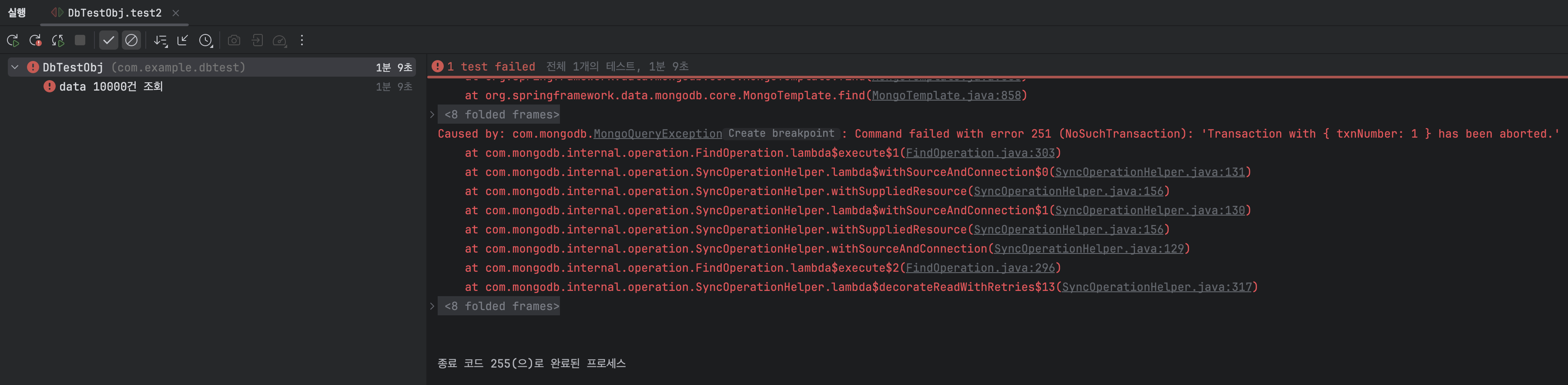 처리시간이 1분이 넘어가면서 transaction이 강제로 timeout되어 abort되면서 예외가 발생했네요.