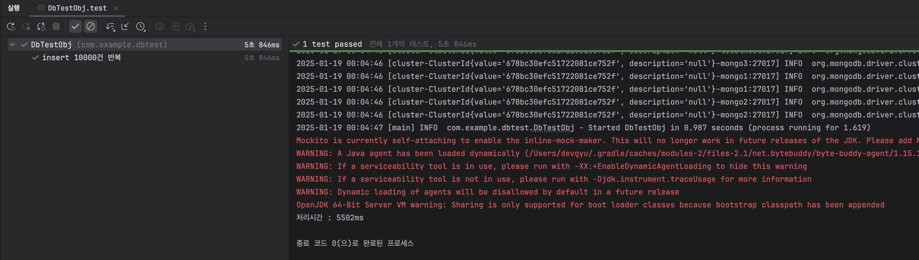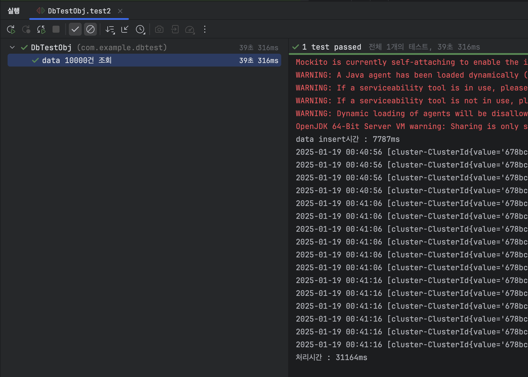 다음은 로컬클러스터에 데이터 10000건 insert한 결과입니다.