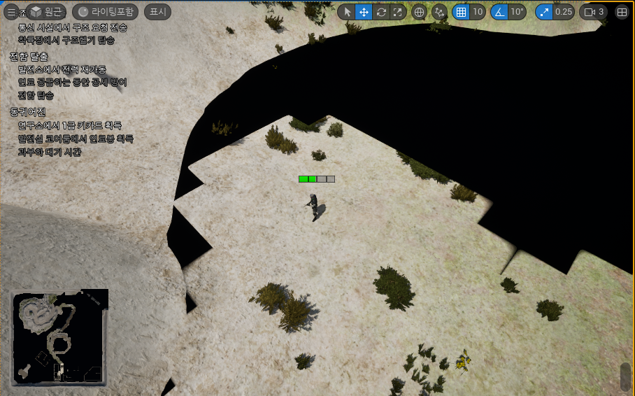 근데, 내 기억엔 컴퍼니오브히어로즈는 잘 되었는데 싶어서 찾아봤더니, 높낮이가 이산적이지 않는데도 표현이 잘 되었고 시점이 고정이 아니라 이리저리 돌릴 수 있었다. 내가 한 것은 검은 배경을 땅 위에다가 올려놓고 가리는 것이기 때문에 틈이 있어 만약, 카메라를 회전한다면 그 틈이 있다는 것이 보인다.