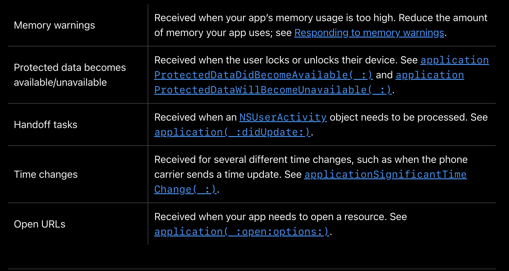 life-cycle 이벤트를 핸들링하는 것에 더해, 앱은 다음 테이블에 나열되어있는 이벤트들에 대해서도 핸들할 수 있어야함. UIApplciationDelegate 객체를 이용해서 대부분의 이벤트를 처리해라. 일부의 경우에 대해서, notification을 사용해서 앱의 다른 파트에 대해서도 처리할 수 있어야한다.