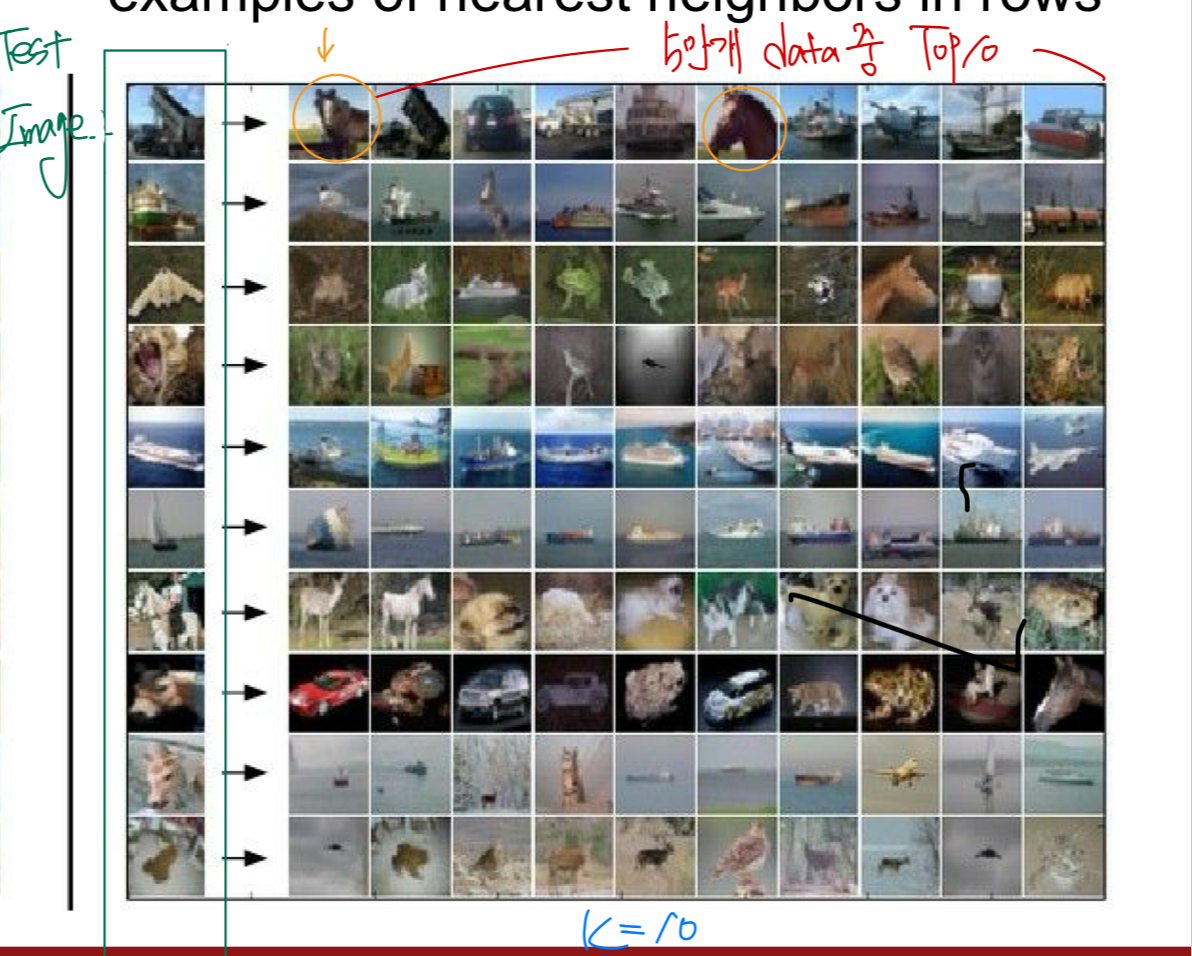 - 50,000개의 train data를 Nearest Neighbor 를 통해 구현하면 다음과 같은 test image에서 정확도에 따라 Top10을 보여준다