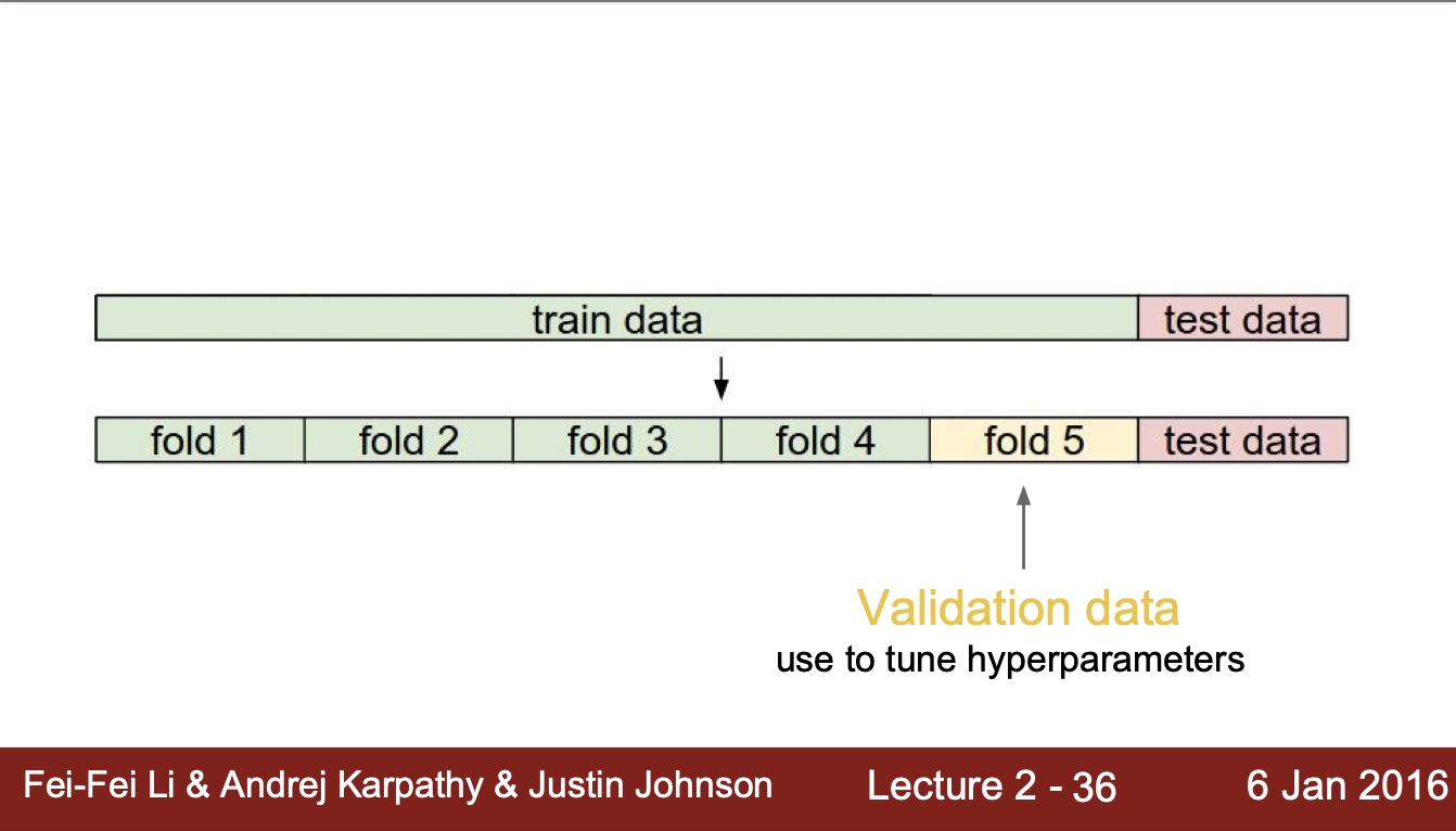 - train data 개수가 너무 적어 validation data로 분류하기 힘들다면 Cross validation 방법도 있음