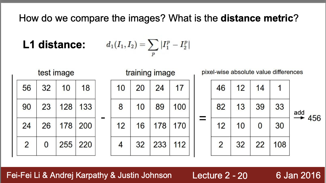 - L1 distance = 각 행렬의 차를 구한 후 행렬 원소의 총합
