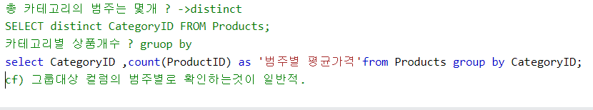 distinct ->(행단위) 중복 제거 -> 행을 합칠 때 다른 행들의 값을 지움. -> 단순히 범주만 보고 싶을 때