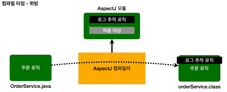 - .java 소스 코드를 컴파일러를 사용해서 .class 를 만드는 시점에 부가 기능 로직을 추가할 수 있다. 이때는AspectJ가 제공하는 특별한 컴파일러를 사용해야 한다. 컴파일 된 .class 를 디컴파일 해보면 애스펙트 관련 호출 코드가 들어간다. 이해하기 쉽게 풀어서 이야기하면 부가 기능 코드가 핵심 기능이 있는 컴파일된 코드 주변에 실제로 붙어 버린다고 생각하면 된다. AspectJ 컴파일러는 Aspect를 확인해서 해당 클래스가 적용 대상인지 먼저 확인하고, 적용 대상인 경우에 부가 기능 로직을 적용한다. 참고로 이렇게 원본 로직에 부가 기능 로직이 추가되는 것을 위빙(Weaving)이라 한다