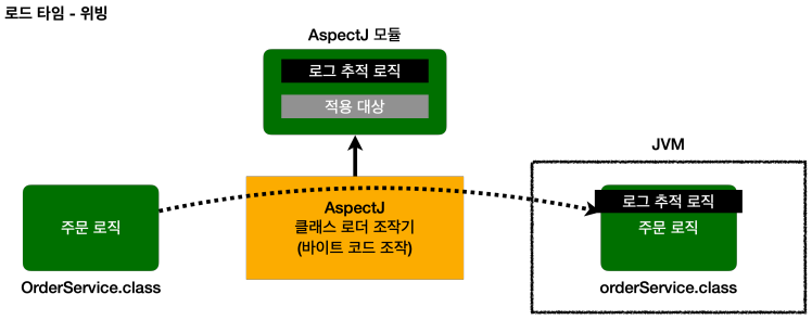 - 자바를 실행하면 자바 언어는 .class 파일을 JVM 내부의 클래스 로더에 보관한다. 이때 중간에서 .class 파일을 조작한 다음 JVM에 올릴 수 있다. 자바 언어는 .class 를 JVM에 저장하기 전에 조작할 수 있는 기능을 제공한다. 궁금한 분은 java Instrumentation를 검색해보자. 참고로 수 많은 모니터링 툴들이 이 방식을 사용한다. 이 시점에 애스펙트를 적용하는 것을 로드 타임 위빙이라 한다.