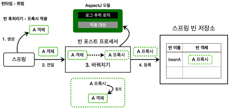 클래스 로딩 시점: 실제 대상 코드에 애스팩트를 통한 부가 기능 호출 코드가 포함된다. AspectJ를 직접 사용해야한다.