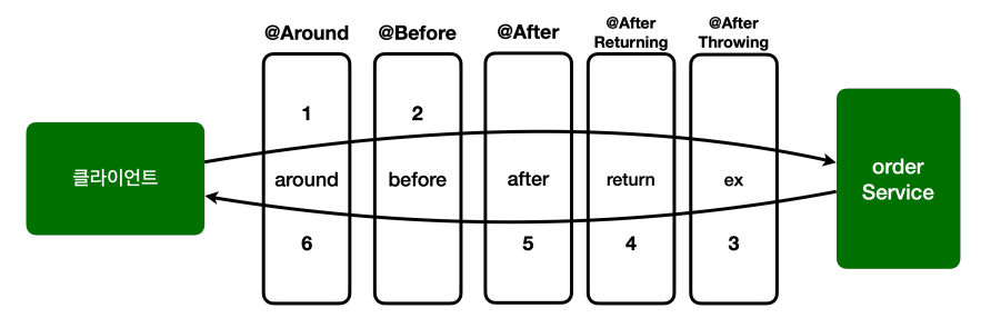 - 실행 순서: @Around , @Before , @After , @AfterReturning , @AfterThrowing