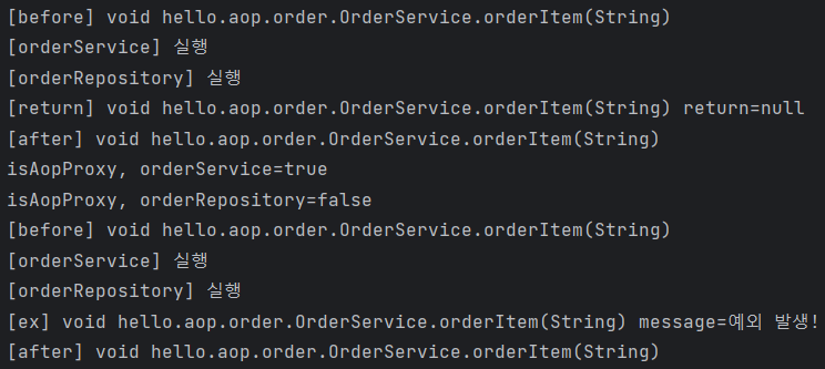- @Around 와 다르게 작업 흐름을 변경할 수는 없다. @Around 는 ProceedingJoinPoint.proceed() 를 호출해야 다음 대상이 호출된다. 만약 호출하지 않으면 다음대상이 호출되지 않는다. 반면에 @Before 는 ProceedingJoinPoint.proceed() 자체를 사용하지 않는다. 메서드 종료시 자동으로 다음 타켓이 호출된다. 물론 예외가 발생하면 다음 코드가 호출되지는 않는다.