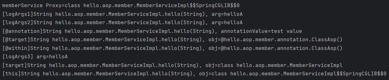 - @annotation : 메서드의 애노테이션을 전달 받는다. 여기서는 annotation.value() 로 해당 애노테이션의 값을 출력하는 모습을 확인할 수 있다.
