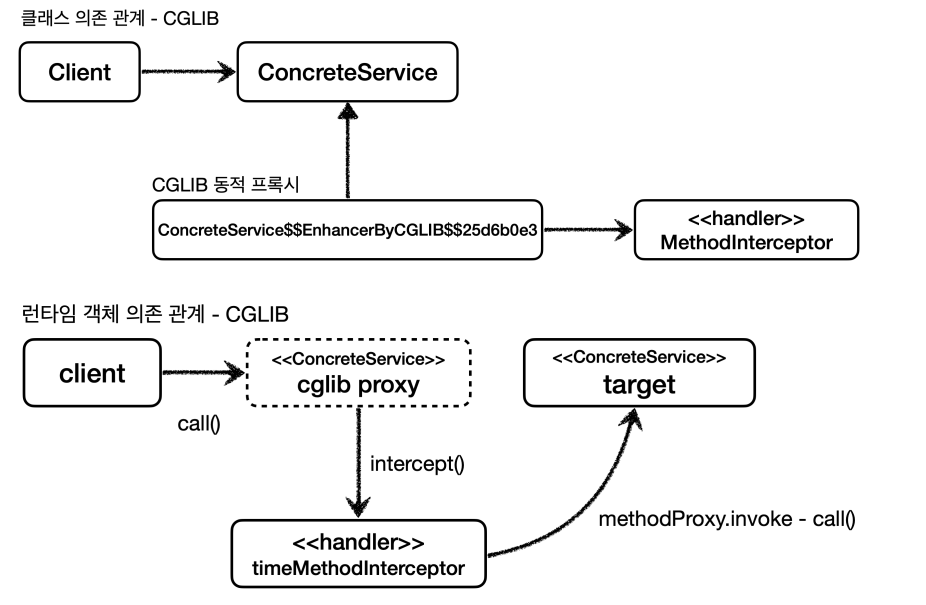 - TimeMethodInterceptor 는 MethodInterceptor 인터페이스를 구현해서 CGLIB 프록시의 실행 로직을 정의한다.