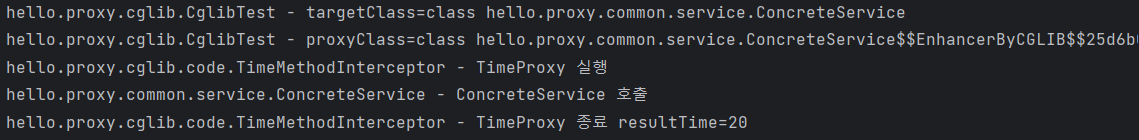 - enhancer.create() : 프록시를 생성한다. 앞서 설정한 enhancer.setSuperclass(ConcreteService.class) 에서 지정한 클래스를 상속 받아서 프록시가 만들어진다.