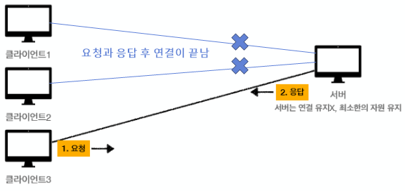 - 무상태 프로토콜(스테이스리스), 비연결성