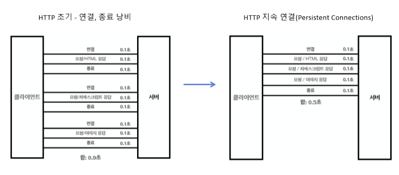 - 지금은 HTTP 지속 연결(Persistent Connections)로 문제 해결