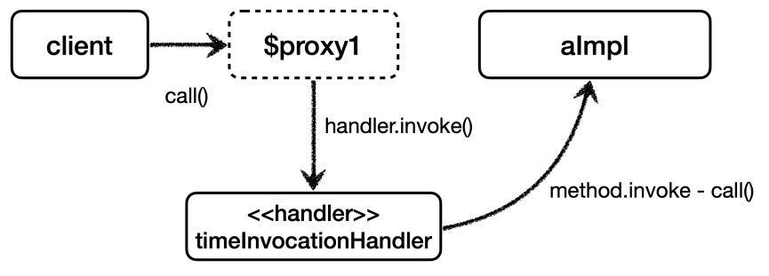 - TimeInvocationHandler 가 내부 로직을 수행하고, method.invoke(target, args) 를 호출해서 target 인 실제 객체( AImpl )를 호출한다.