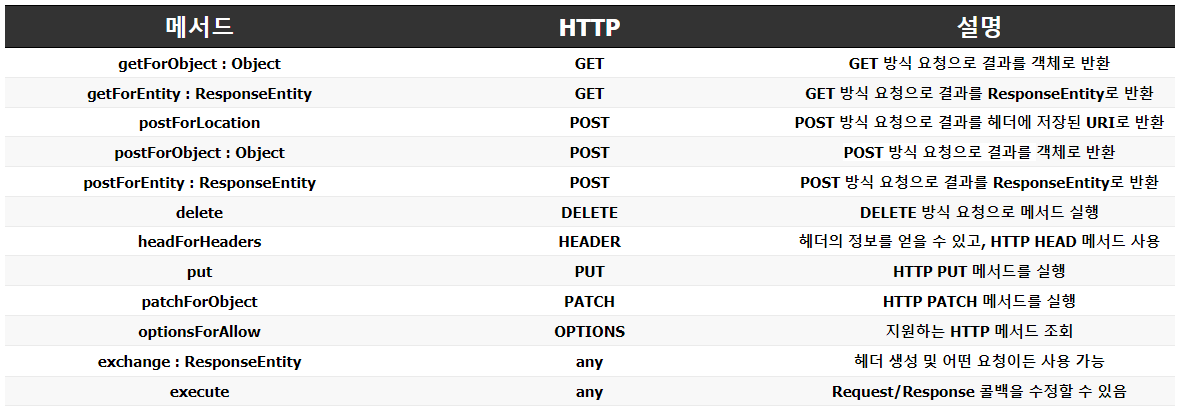 - Rest API 서비스를 요청 후 응답 받을 수 있도록 설계되어있으며 HTTP 프로토콜의 메소드(ex. GET, POST, DELETE, PUT)들에 적합한 여러 메소드들을 제공