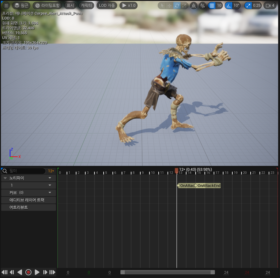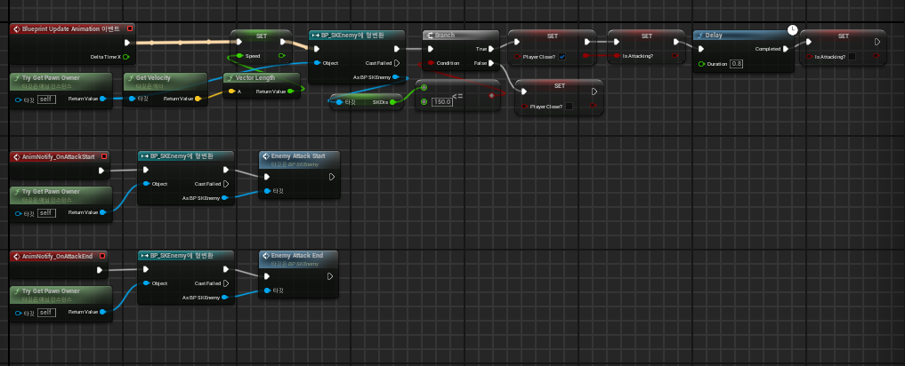 ABP에서는 본인의 이동 속도를 측정하여 Idle/Run의 블렌드 스페이스를 조정하고 플레이어가 가깝다면 Attack, Attack이 끝나면 다시 Idle/Run를 진행한다.