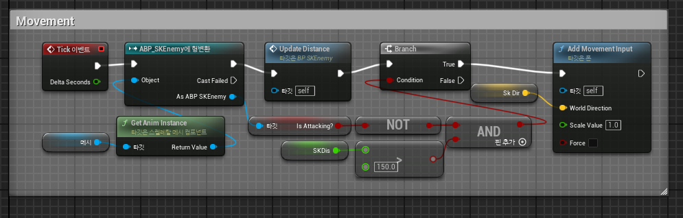 거리를 보고 받은 뒤 현재 공격중이 아니고 플레이어와 거리가 150이 넘으면 이동하도록 만들었다.