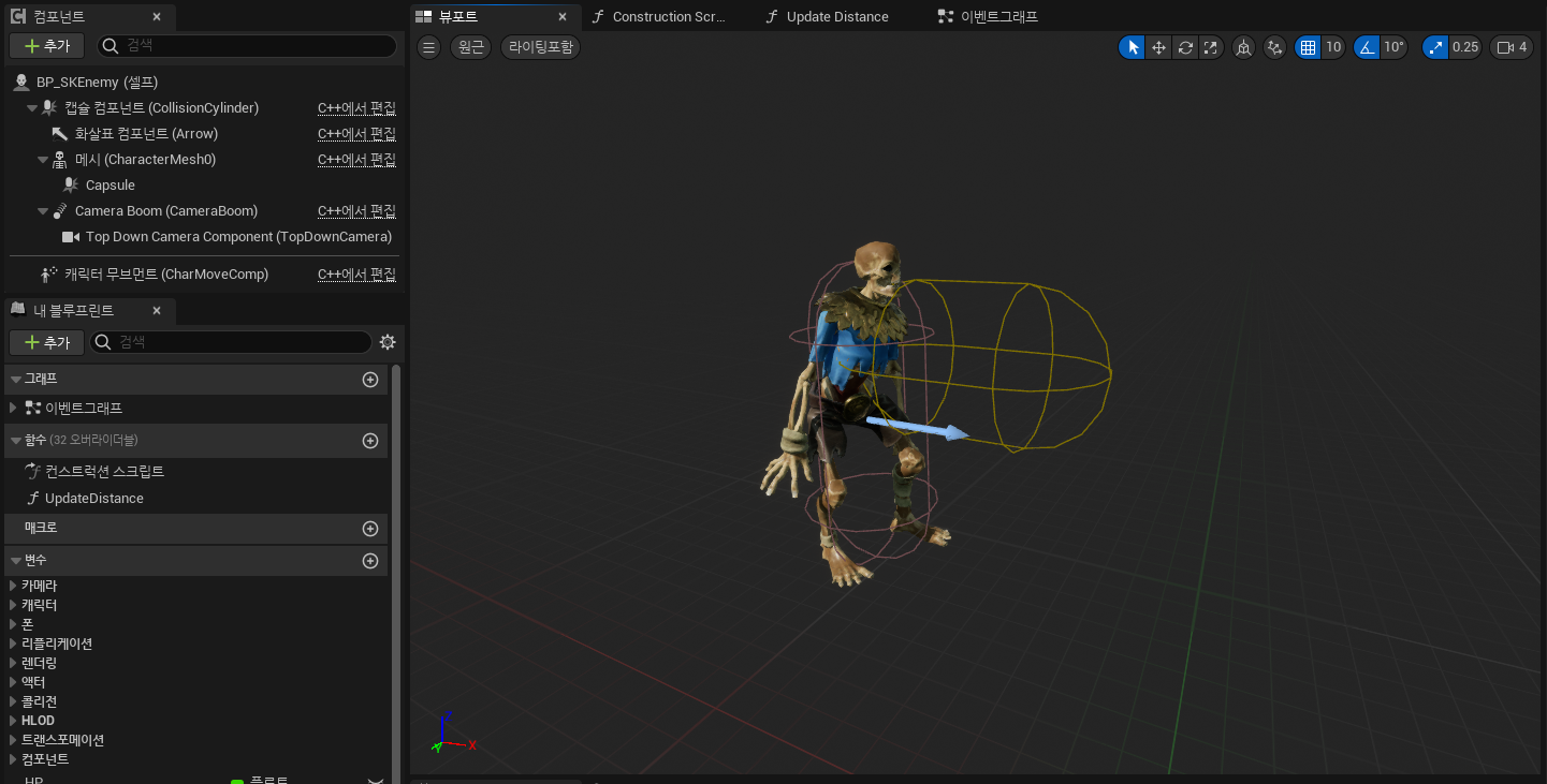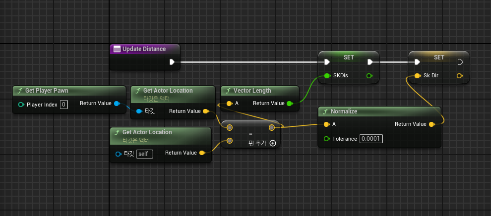 먼저 몹의 이동을 위해서 몹과 플레이어의 거리를 구할 필요가 있어 적 블루프린트 안에 Update Distance함수를 생성하고 틱에 연결하여 실시간으로 거리를 보고받도록 만들었다.