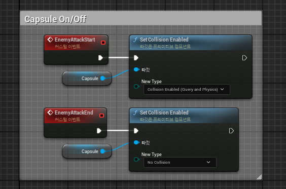 캐릭터BP에서 캡슐을 키고 끄는 커스텀 이벤트를 작동한다.