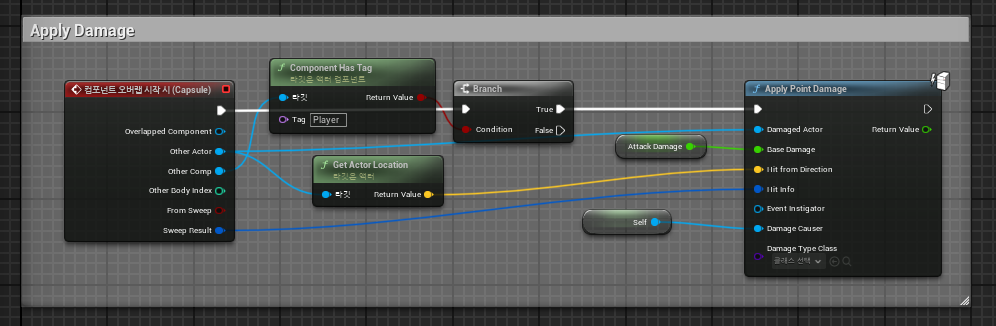 캡슐이 Player라는 태그를 가진 콜리전과 오버랩될 경우 대미지를 입힌다.