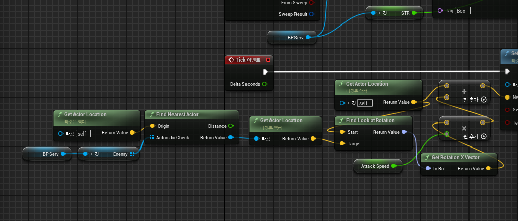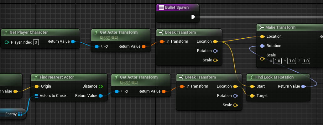 적을 배열에 묶어 Find Nearst Actor를 활용하여 총알이 가장 가까운 적을 바라보고 스폰되도록 만들어주었다.