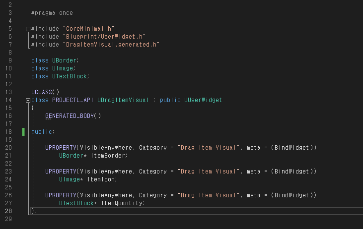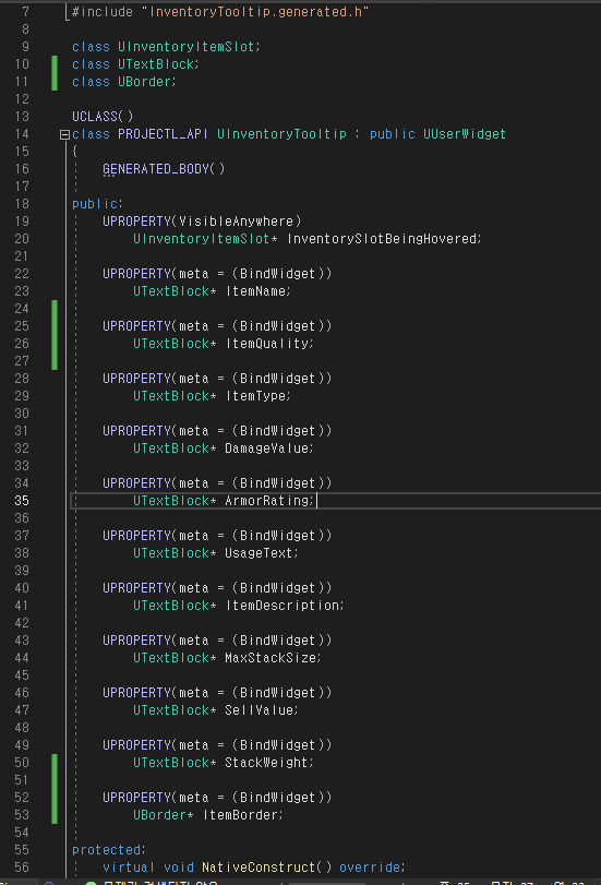 아이템 슬롯은 아이템이 마우스로 드래그 될 경우 작게 표현될 DragItemVisualClass와 아이템에 마우스를 올리면 아이템의 정보를 알려줄 ToolTipClass를 TSubclassOf로 받는다.