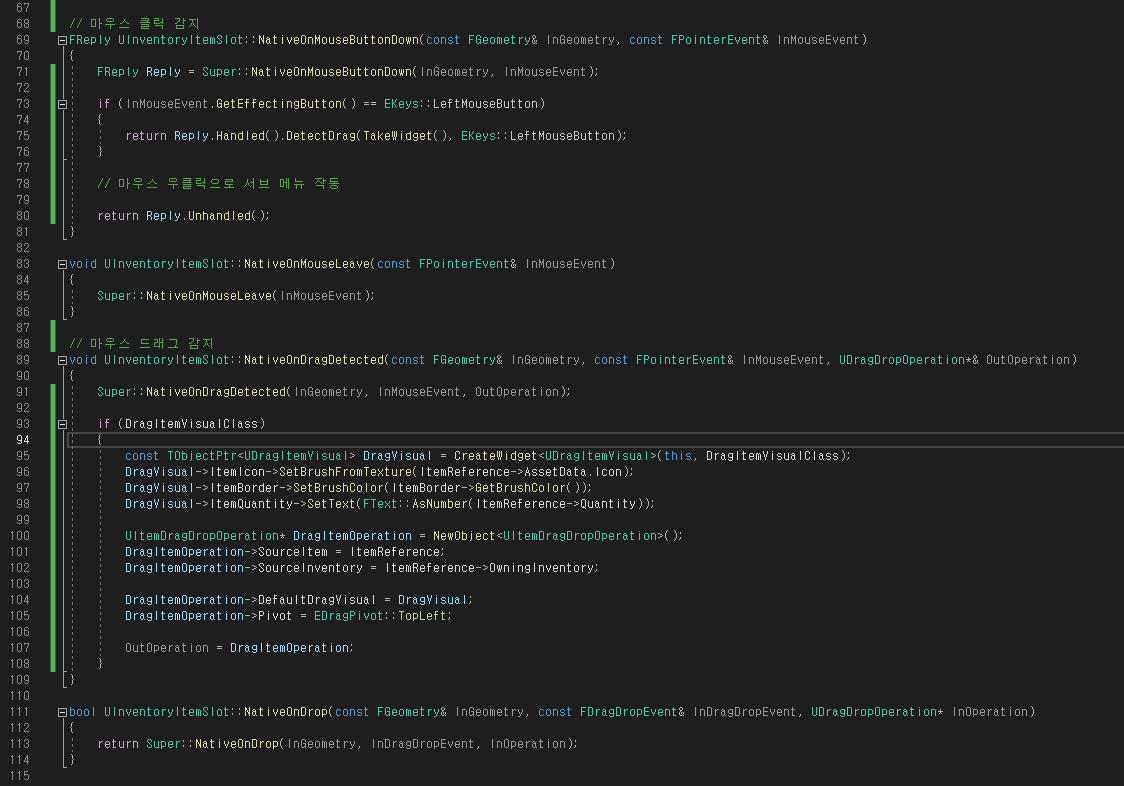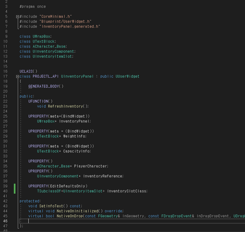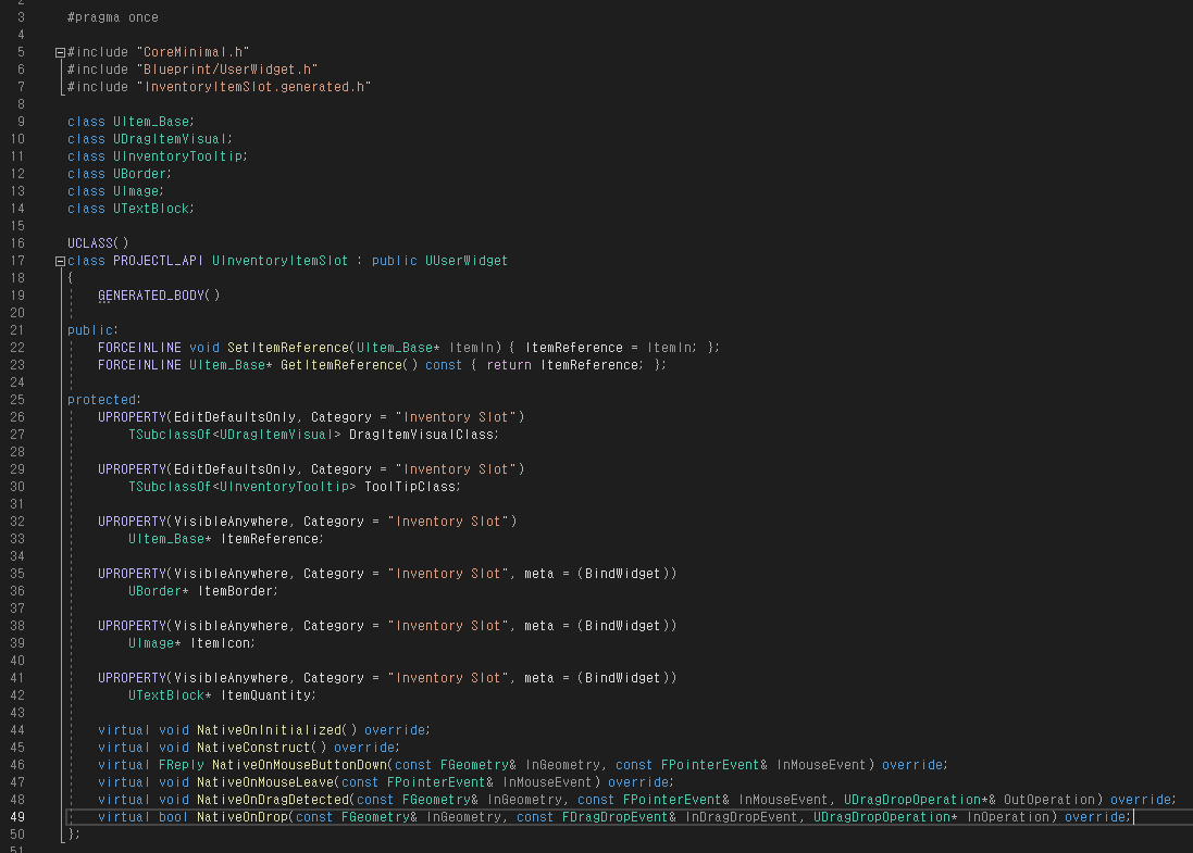 ItemDragDropOperation은 UDragDropOperation을 상속받은 클래스로 아이템과 인벤토리만 선언 해주었다.