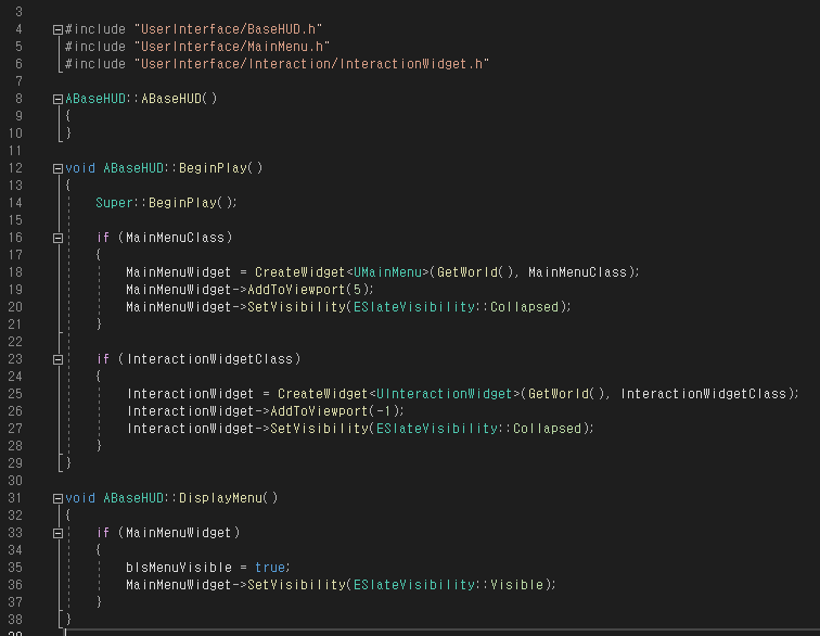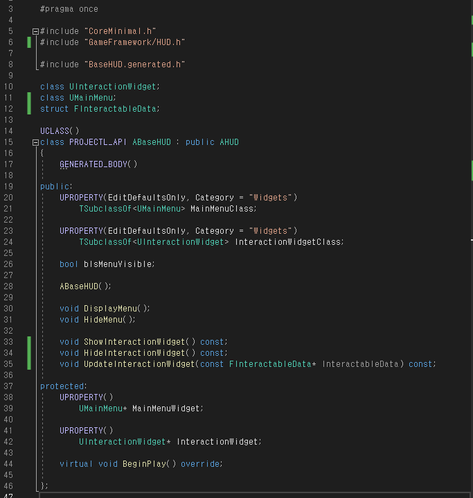 BaseHUD를 만들고 이것을 기반으로 MainMenu 위젯과 InteractionWidget 위젯을 만들어 연결해줄 예정이다.
