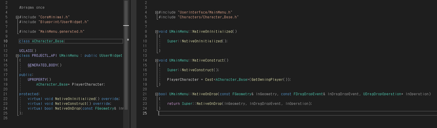 cpp파일에서 Super가 계속 UUserWidget에서 상속받은 것을 인지하지 못하고 그의 윗 부모인 UWidget에는 멤버가 존재하지 않는다는 말만 반복하며 오류가 떴다.