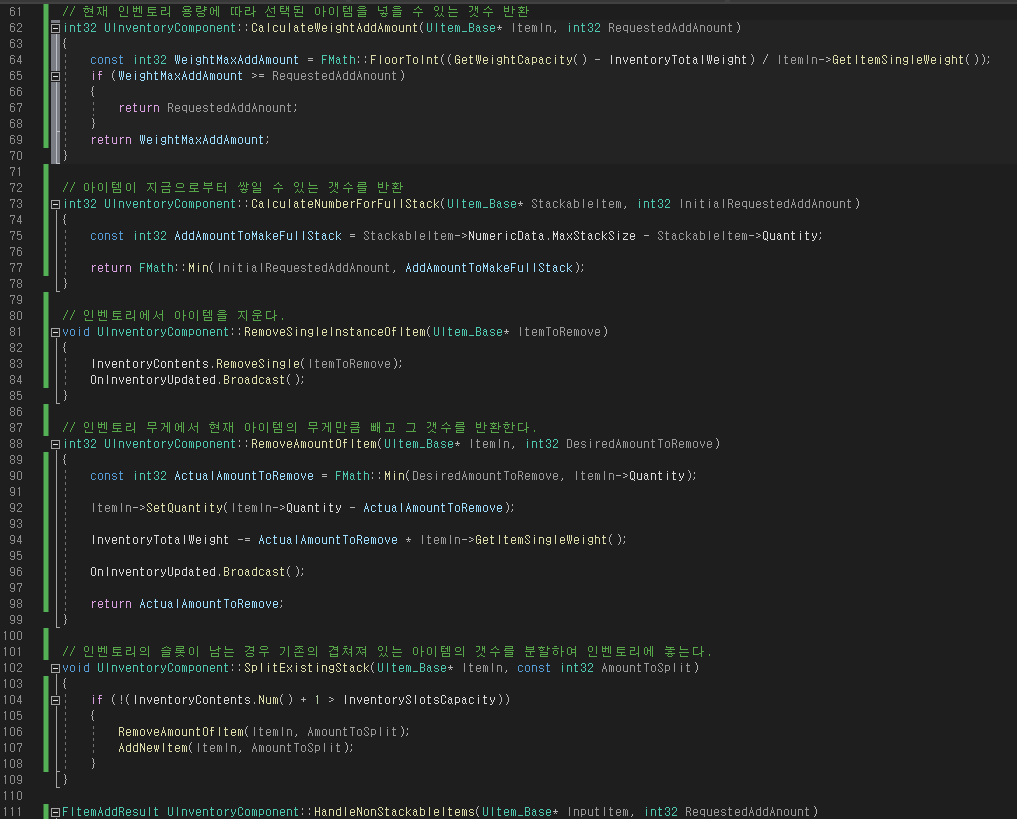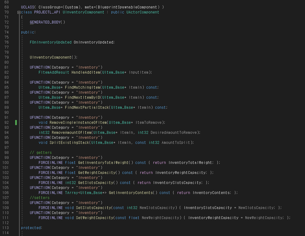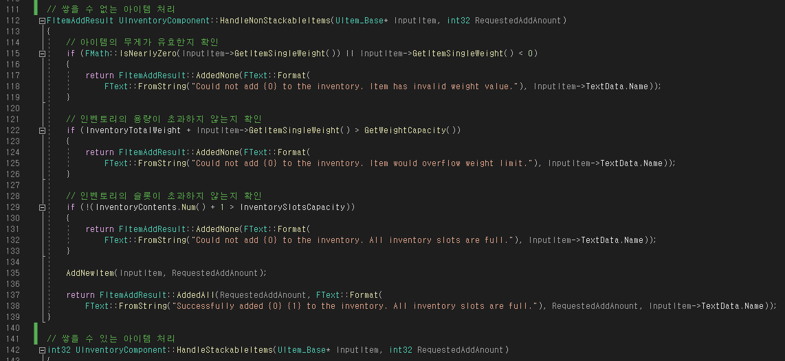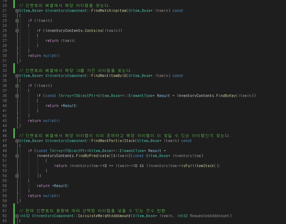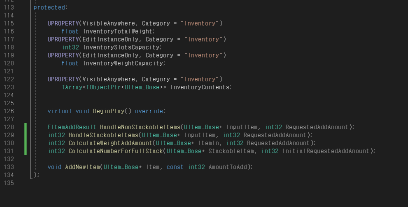 인벤토리의 무게나 슬롯 용량을 다루는 변수, 인벤토리 배열 변수, 쌓을 수 있는 아이템과 없는 아이템을 나눠서 처리하는 함수, 무게나 슬롯 용량을 계산하는 함수, 아이템을 추가하는 함수를 선언한다.