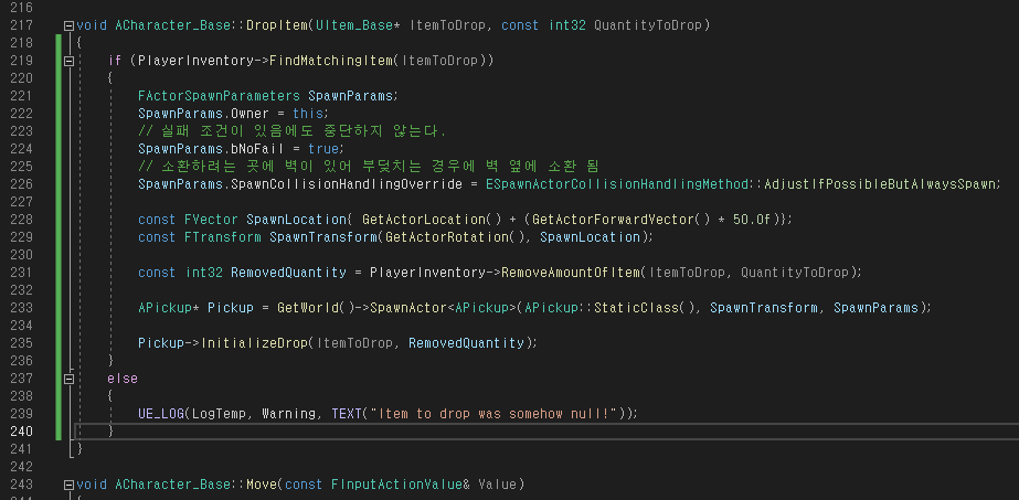 캐릭터에 DropItem 함수를 추가하여 SpawnParams와 캐릭터의 위치를 토대로 드롭한 아이템이 스폰되도록 만들었다.