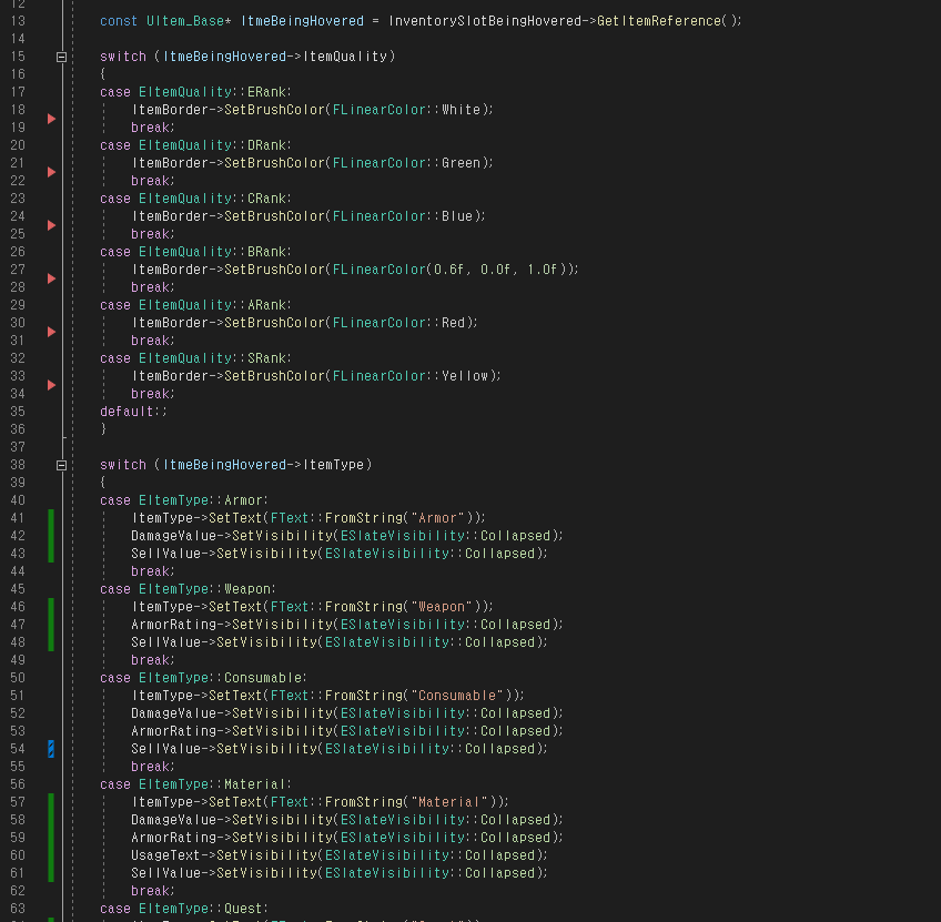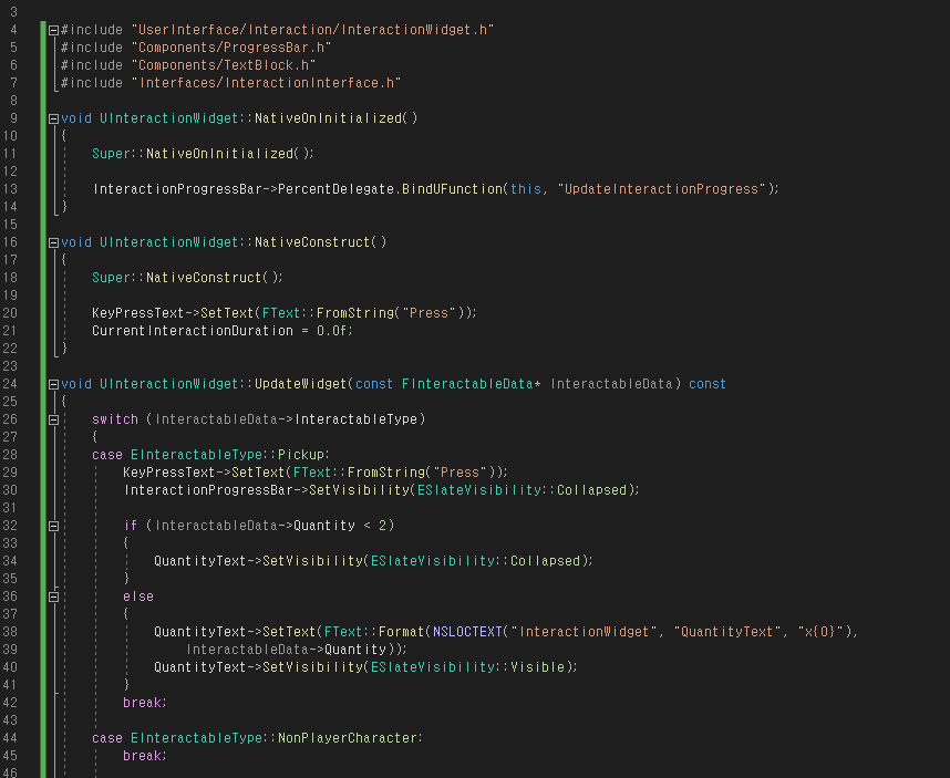 UpdateWidget은 상호작용할 액터의 상호작용 데이터에 접근하여 데이터 타입을 체크해 관련 위젯을 띄울수 있도록 switch 함수를 사용하였다.